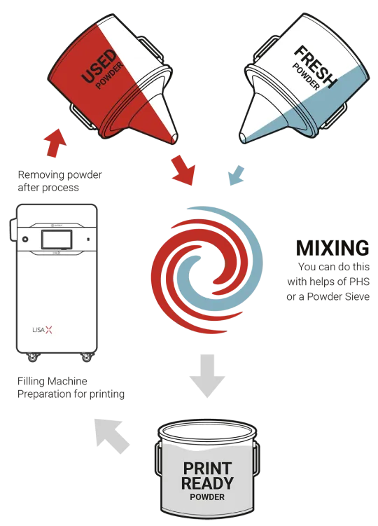 The recommended refresh ratio is 20%, meaning you should add 20% fresh powder to the unsintered material after each print. While the powder is technically 100% reusable, adding fresh powder helps maintain optimal print quality.