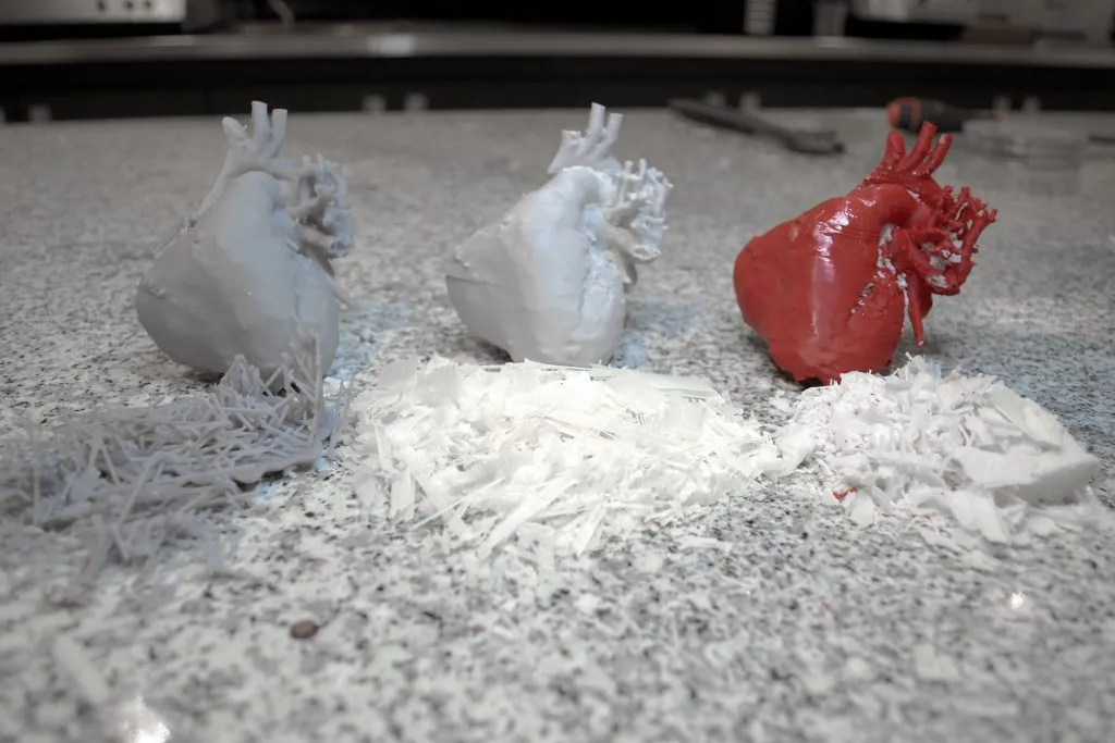 Usunięcie struktur podporowych pociąga za sobą dodatkowy czas poświęcony na przygotowanie modeli. W przypadku modeli ABS i PLA może to zająć dużo czasu, zwłaszcza jeśli powierzchnia modelu jest szorstka, a podpora nie odchodzi łatwo. Tak było w przypadku dwóch modeli serc. W niektórych miejscach modelu podporę można było łatwo usunąć, podczas gdy w innych było to niemożliwe pomimo dodania dużej siły. W przypadku modelu z żywicy obróbka była dosyć prosta – struktury w przewężeniu pomiędzy powierzchnią modelu a strukturą musiały zostać odcięte. Jednak, aby nie uszkodzić tak złożonego modelu, wymagało to dużo czasu i mimo wszystko pozostawiało zniekształcenia. W przypadku modelu SLS na szczęście nie mamy odpadów – pozostały z procesu drukowania proszek można odświeżyć (lub w niektórych przypadkach nawet nie trzeba) i ponownie wykorzystać.