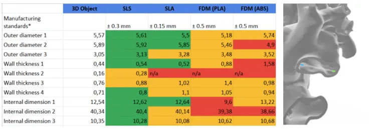 W przypadku modelu z żywicy okazało się również, że w głębi modelu proces utwardzania materiału nie został całkowicie zakończony, co spowodowało rozmycie się geometrii. W przypadku pomiarów dokładności, technologia SLS dużo zyskuje dzięki brakowi struktur podporowych – w większości przypadków pomiary mieściły się w granicach +/- 0,1 mm, co można uznać za wysoką dokładność (standard produkcji wg 3D Hubs w technologii SLS wynosi +/- 0,3 mm).